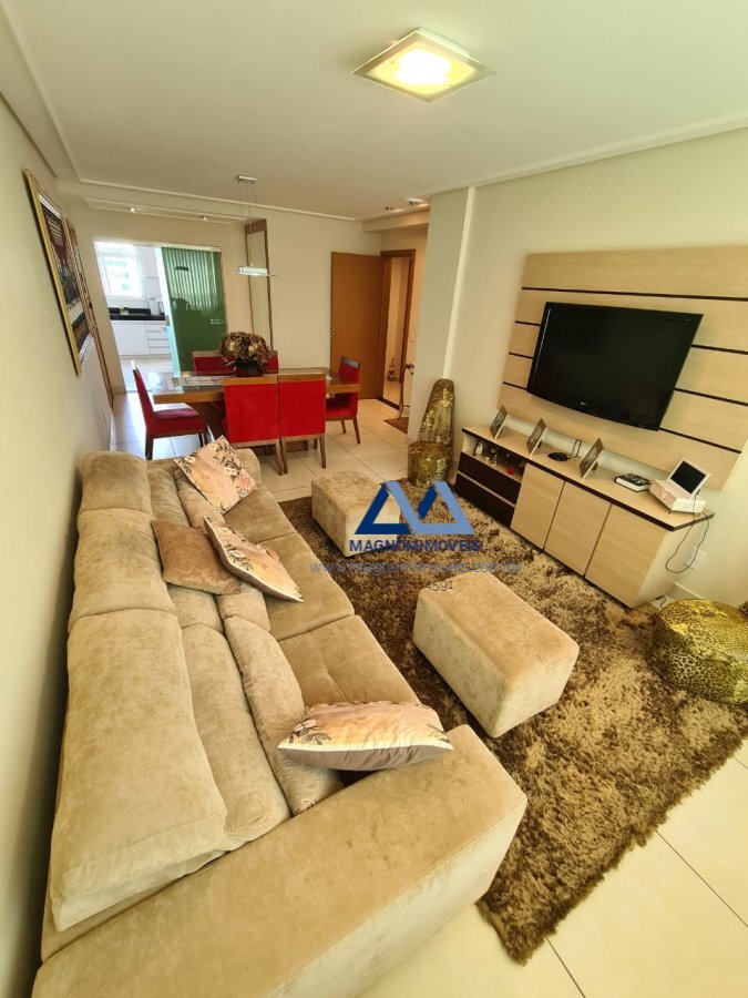 Apartamento: Sala em doisambientes,três dormitóriossendo 02 suítes, Localizado no último andar (5°), com 102,00 m² de área privativa, acabamento diferenciado, todo decorado e mobiliado com papéis de parede, molduras em gesso, piso porcelanato, torneiras e duchas com aquecimento solar, gás canalizado, lavanderia, banheiro social, elevador e 02 vagas espaçosas.