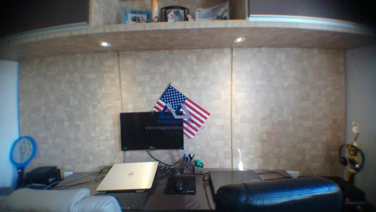 Escritório: Guarda-roupa até o teto, cômoda móvel, nichos, escrivaninha (com uma iluminação exclusiva), gaveteiros, persiana vertical e iluminação principal de descanso