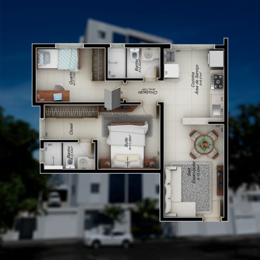 Apartamento:Sala, dois dormitórios sendo uma suite, bs, área de serviço, duas vagas de garagem, salão de festa,