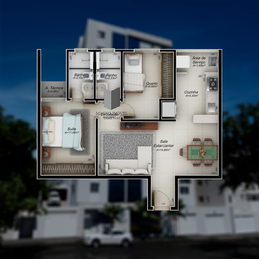 2 Dormitórios, sendo 1 Suíte2 Banheiros2 Vagas1 Cozinha