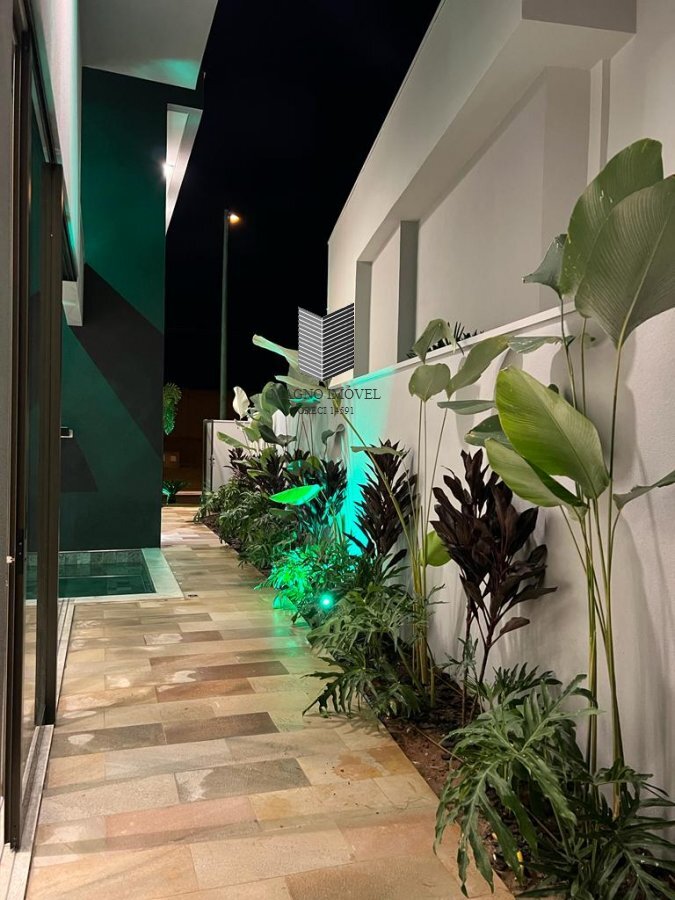 Casa térrea condomínio :Fachada com vista livre trêssuítes sendo uma master com closet, banheira de imersão, duchas e cubas duplas, escritório com banheiro reversível para 4 suíte Sala de TV Despensa/cozinha técnica Ampla área gourmet com bancadas e churrasqueira em Dekton cinza Splendor e mesa acoplada em Branco Stellar. Lazer com piscina aquecida Paisagismo completo Garagem para 4 carros, sendo 2 cobertos Depósito Total 5 banheiros Janela das três suites.automatizadas.